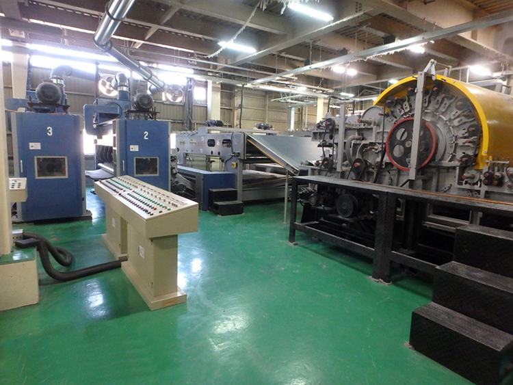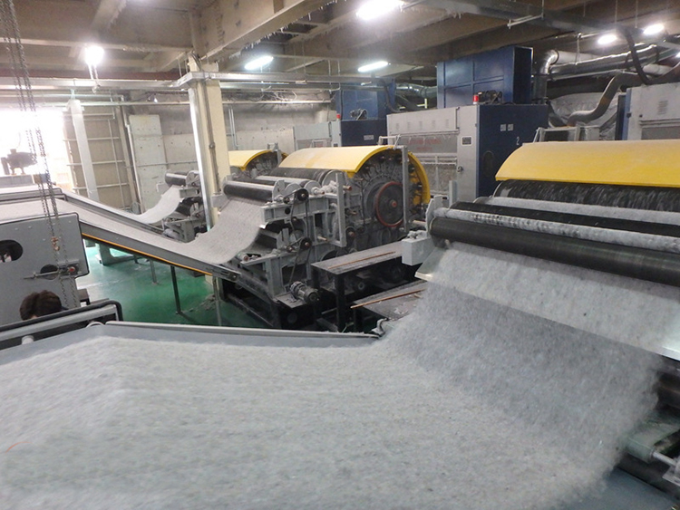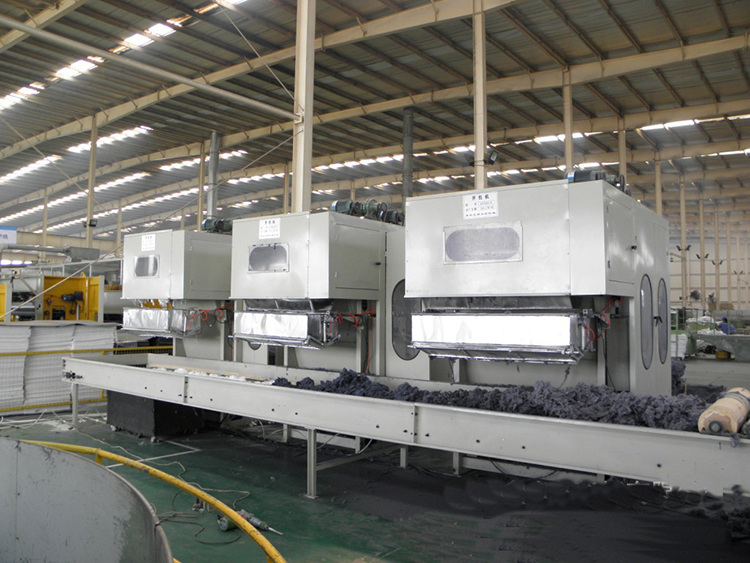 流程:開松機(jī)-棉箱-梳理機(jī)-鋪網(wǎng)機(jī)-預(yù)刺機(jī)-倒刺機(jī)-倒刺機(jī)-主刺機(jī)-成卷機(jī);